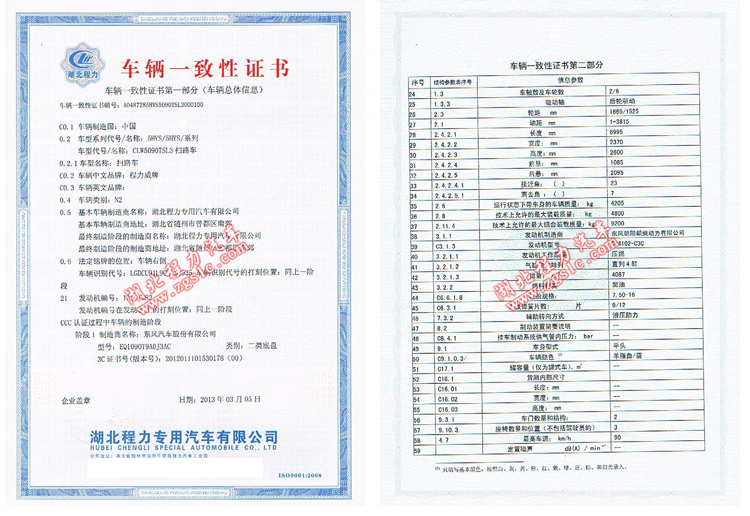 信息來源:湖北程力專用汽車有限公司 近期程力專用汽車股份有限公司經常接到一些客戶的來電,問灑水車、掃路車、高空作業車買回去能不能上牌照,到當地車管所一咨詢,除了合格證、發票等上戶手續之外,還需要提供車輛一致性證書。什么是車輛一致性證書呢?下面湖北程力來為您解答。